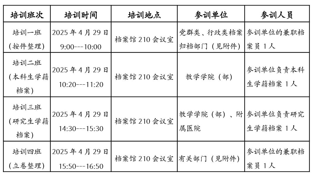 2、培训班实行线下培训,现场签到。培训情况作为学校对各单位档案工作的考核内容。